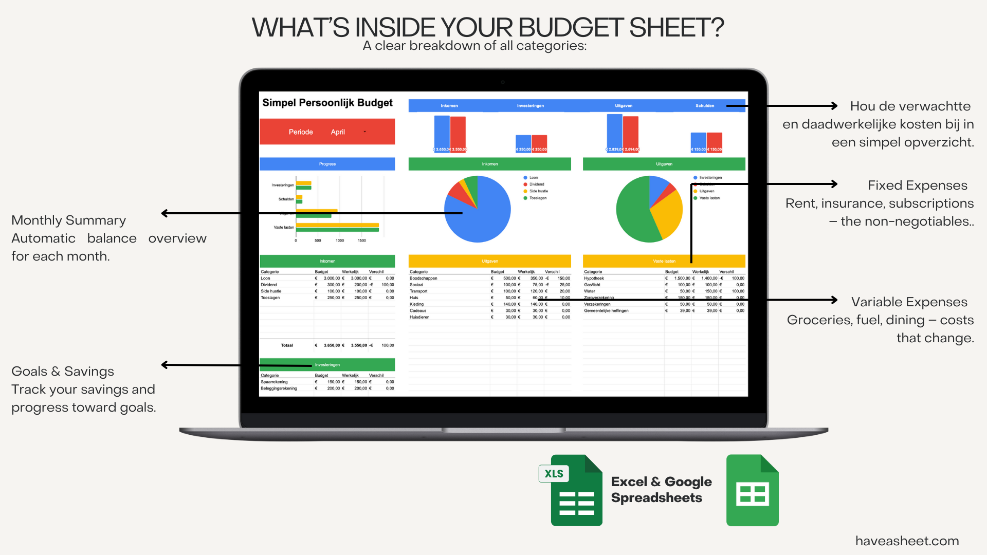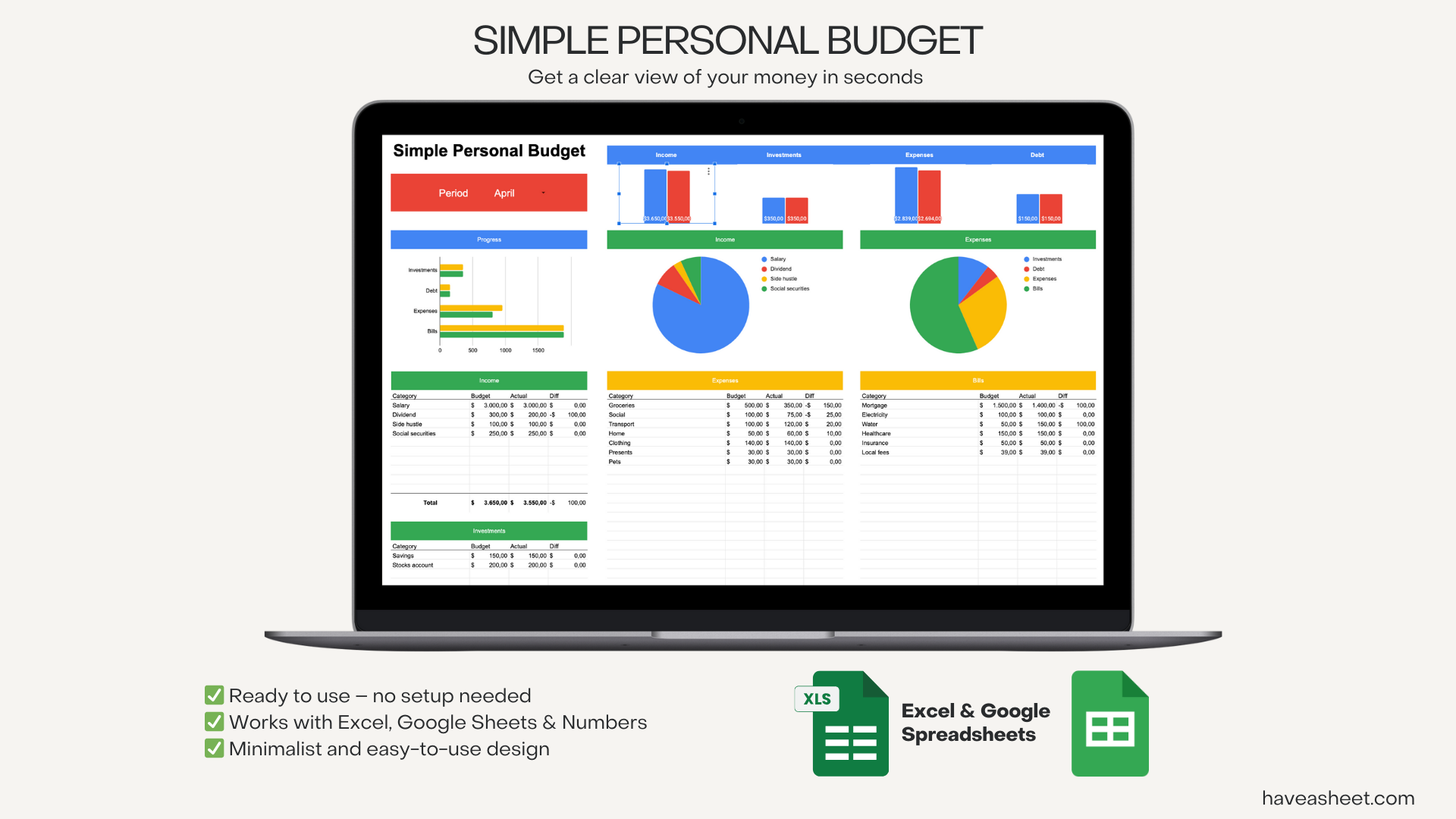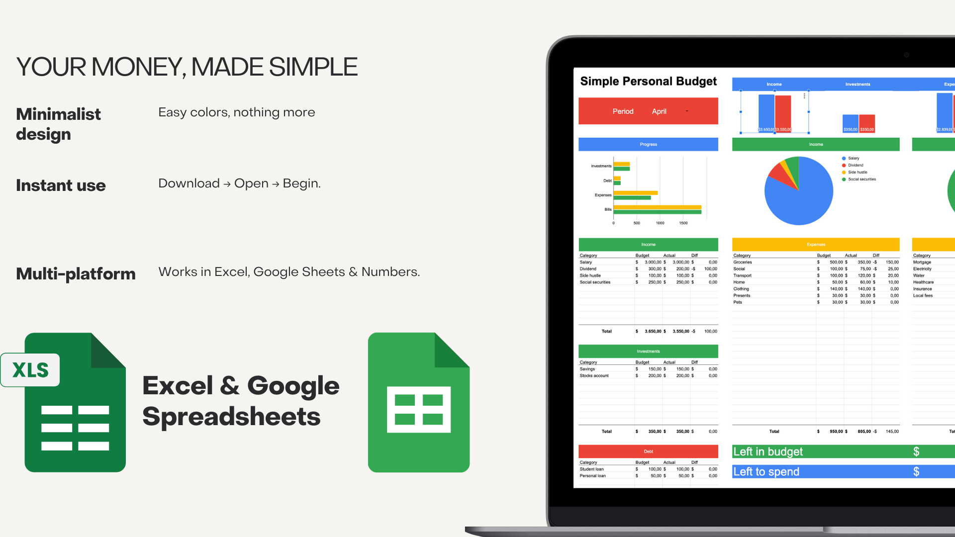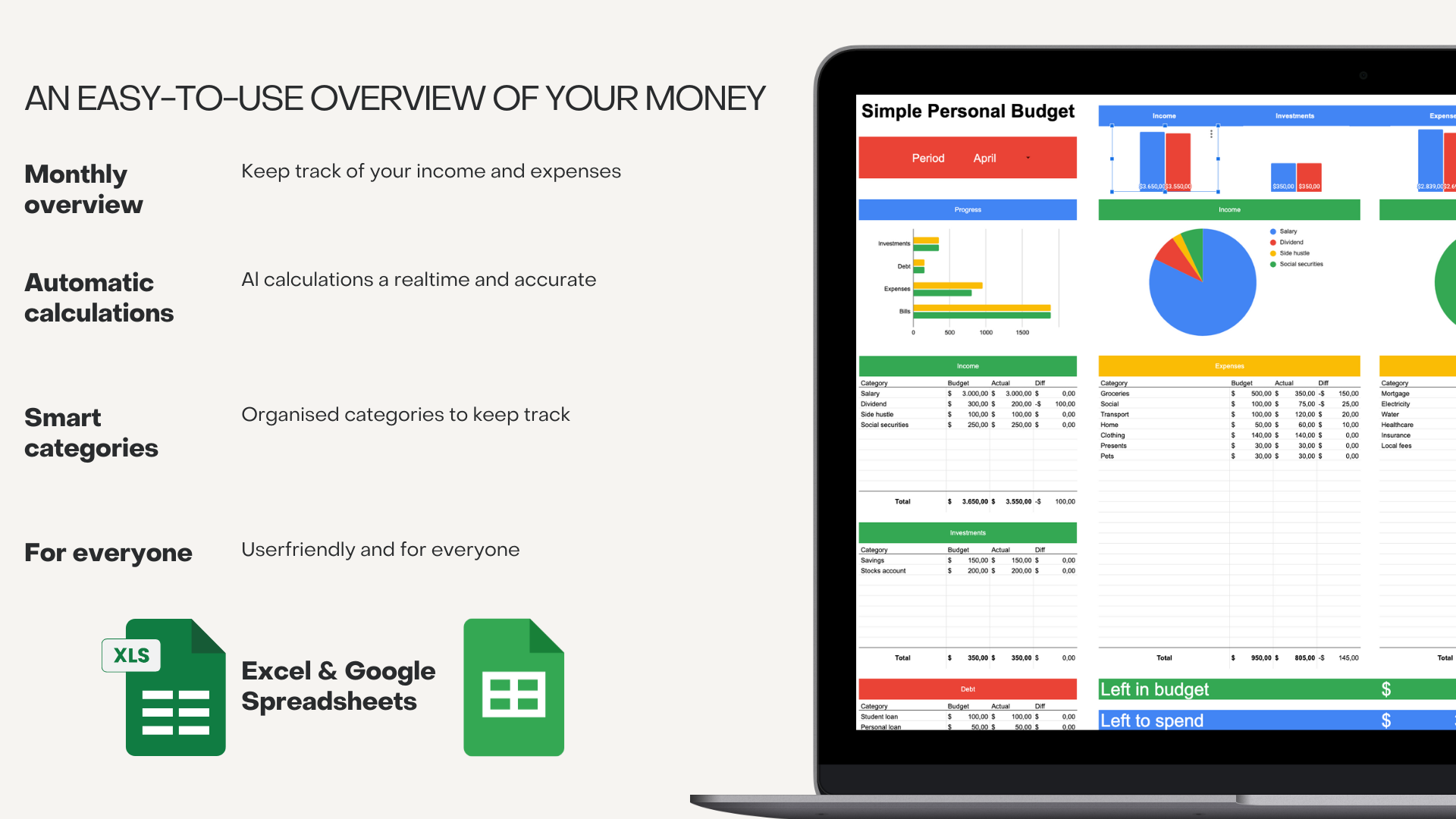 Simple and easy-to-use budget tracker for Excel and Google Sheets. Track your income, expenses, and savings effortlessly with automatic calculations and clear charts. Perfect for personal and family budgeting!